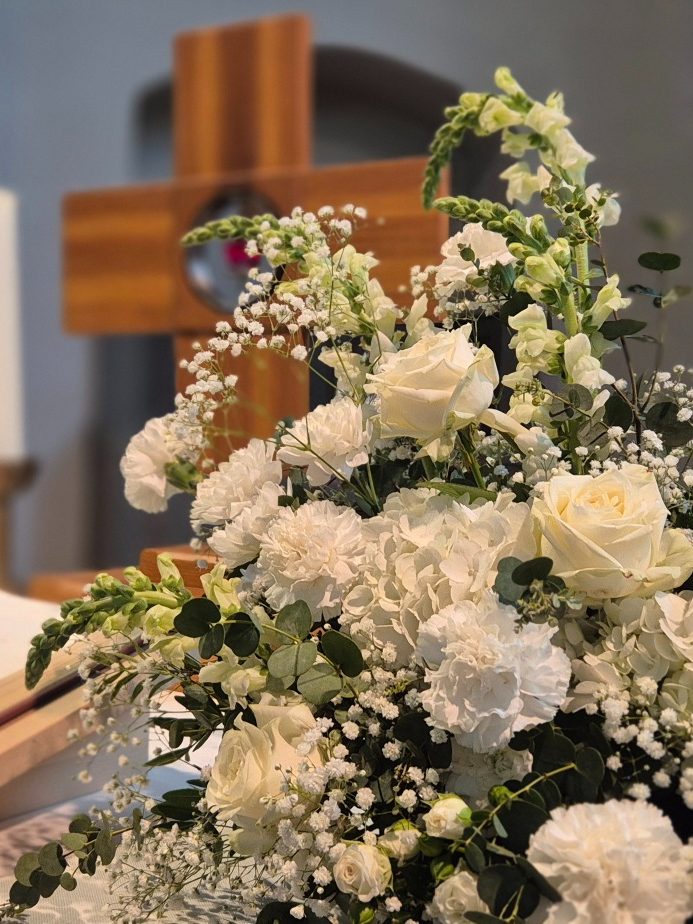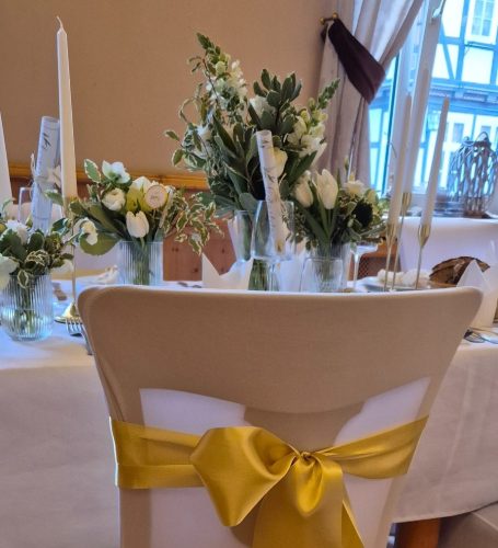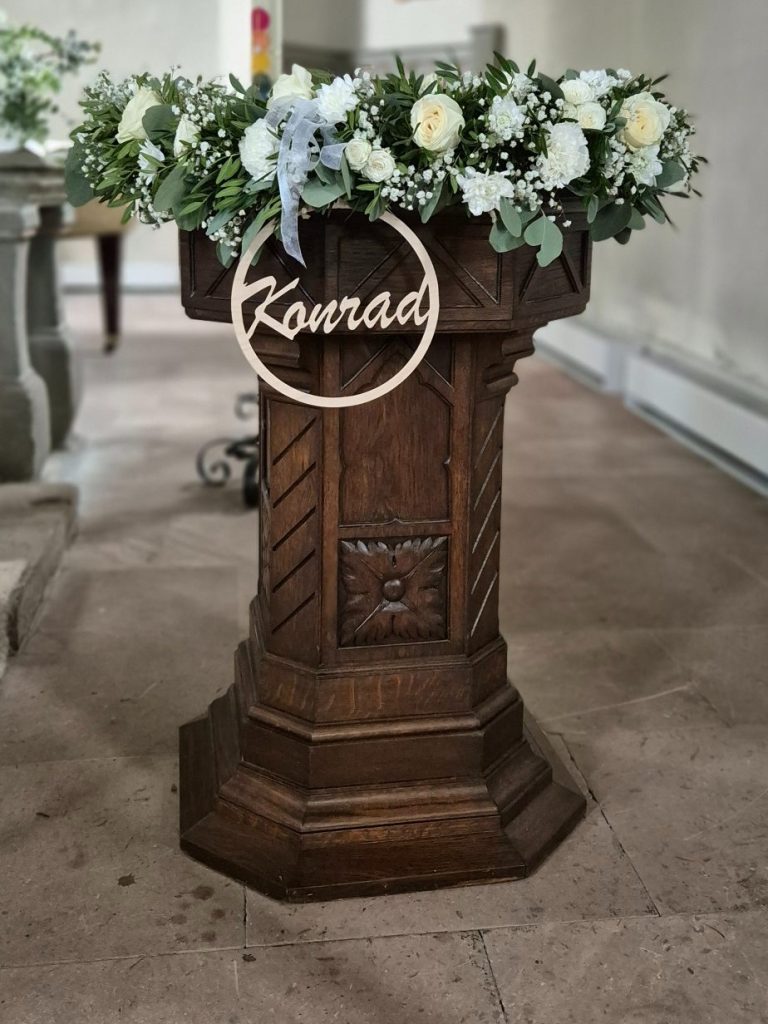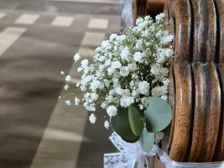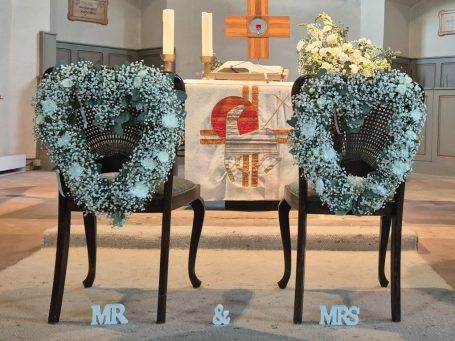 Vom prachtvollen Altargesteck über liebevolle Details wie Blumenschmuck an den Stühlen und Kirchenbänken